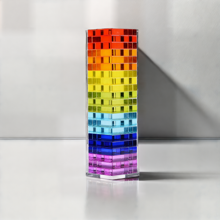Explore the beauty and brilliance of Newton’s Tower, where ingenuity meets vibrant hues! Comprising 63 translucent pieces across the 7 colours of the visible spectrum, this dazzling tumbling tower allows light to dance through, creating a kaleidoscope of mesmerising effects.